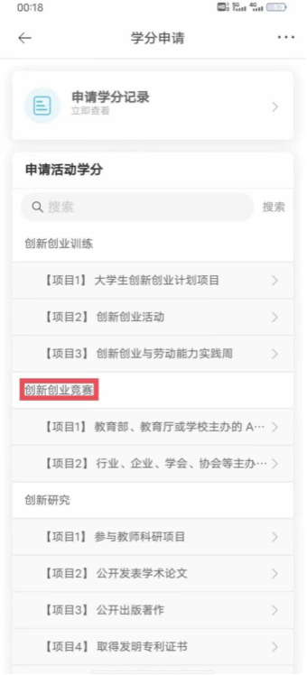 4. 根据自己的获奖情况选择自己申请的学分名称填写自己的竞赛名称