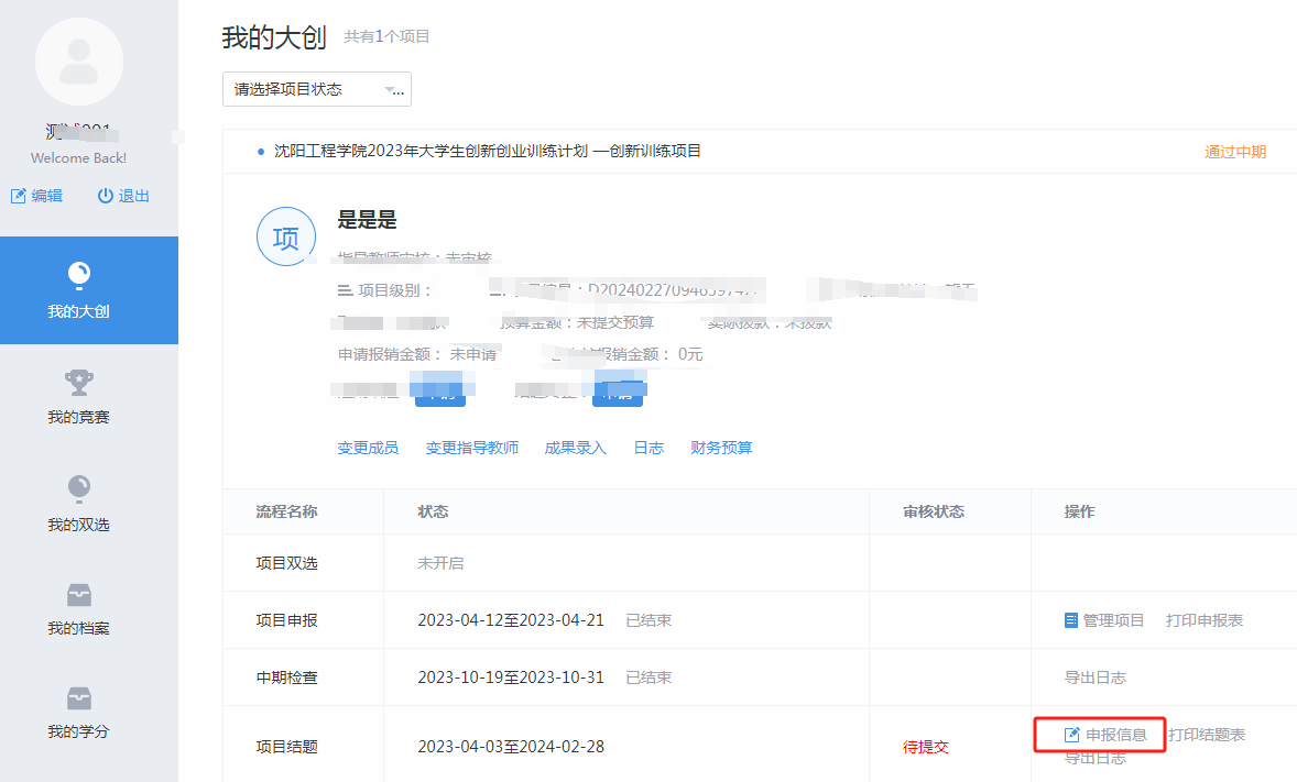 点击“创新创业”进入系统后台。在结题阶段录入需填报内容。