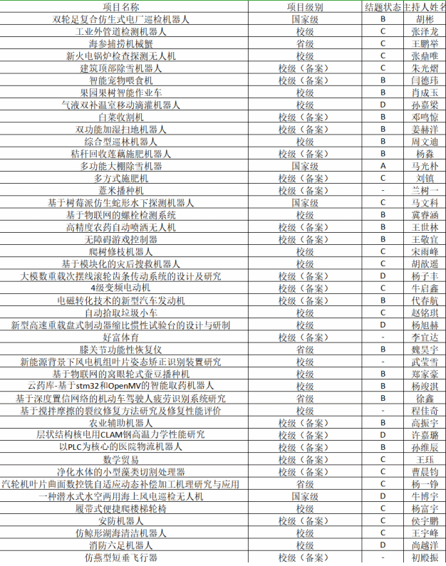 2023年度机械学院大学生创新创业训练计划项目顺利结题45项,其中国家级4项,省级4项,校级17项,校级(备案)20项。