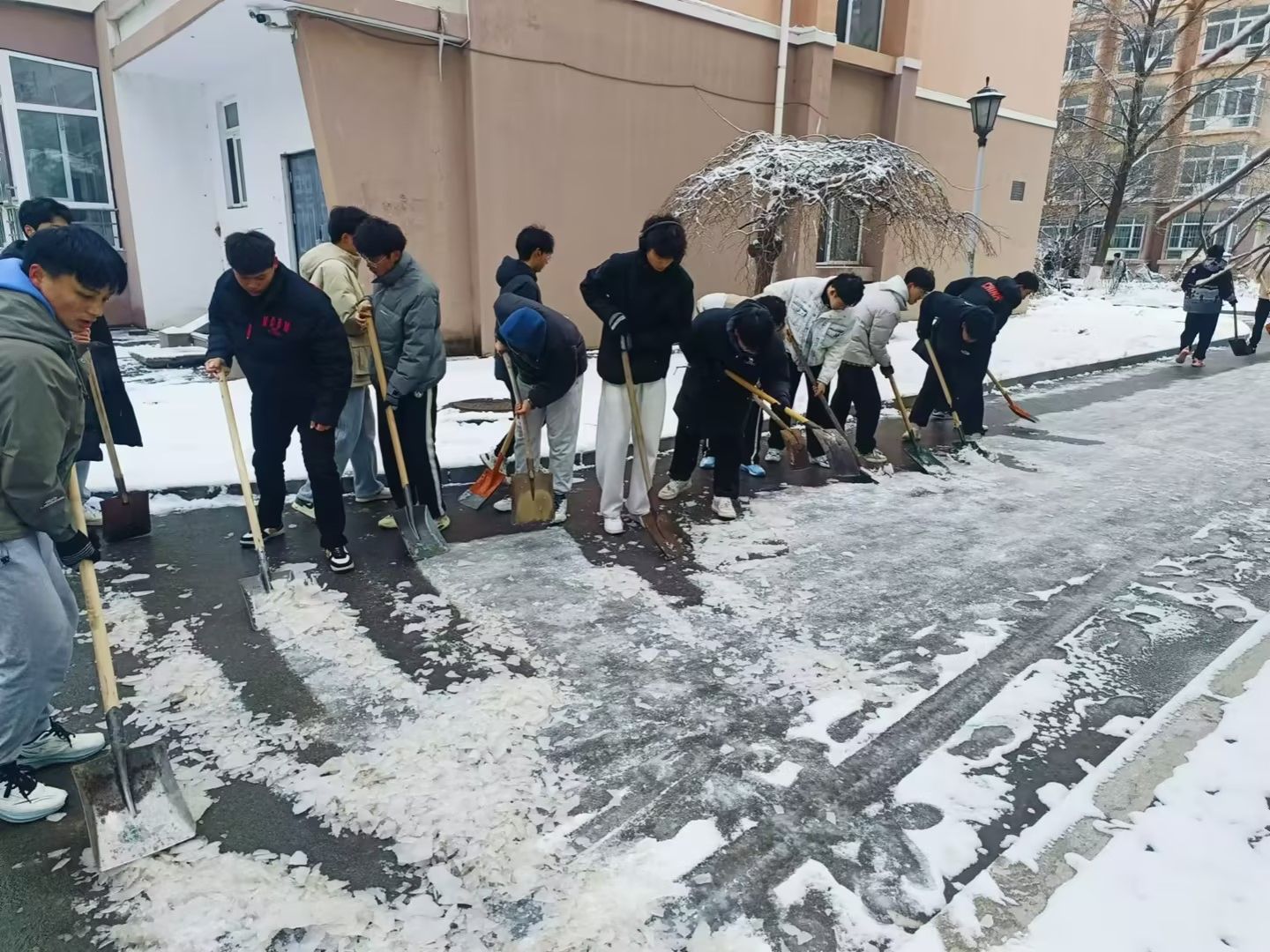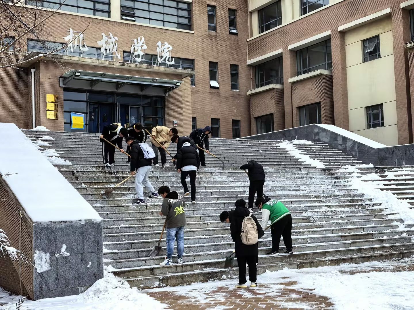 在学生宿舍区域和学院教学楼区域,志愿服务学生干部不畏严寒,手持铁锹工具,有序清理台阶冰雪,校园里的各个角落都留下了学生干部们讲奉献、勇担当的身影。