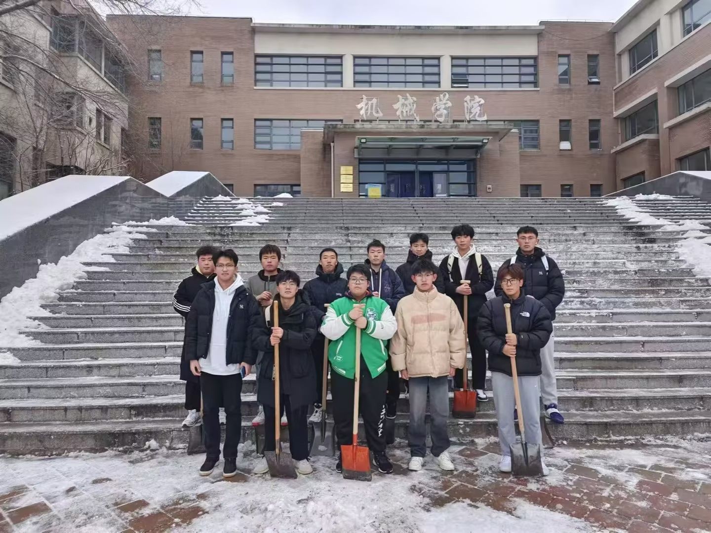 当日中午课间,为消除路面冰雪隐患,保障师生校园安全,学生会生活部、自律部全体干部组成志愿服务清扫队,下课后迅速来到指定区域开展铲雪除冰志愿服务工作,充分发挥机械学院团委学生会学生干部先锋模范带头作用。