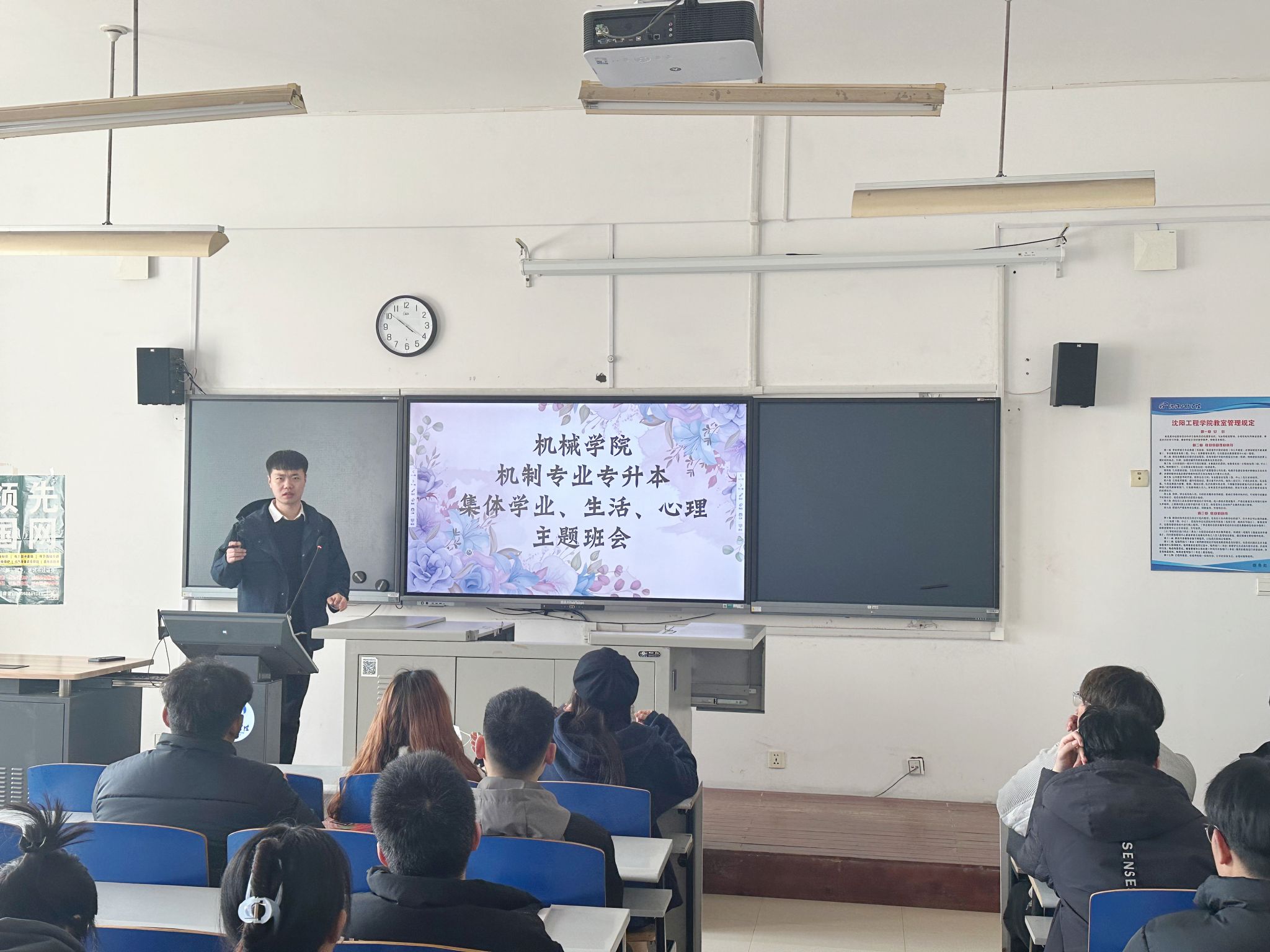 2024年3月20日,为了保障2023级机制专业专升本学生春季新学期学生学业、生活以及心理稳定,进一步提高专升本大学生学习热情,增强专升本学生安全意识,提升自我心理调节能力,开启青春筑梦新征程,机械学院开展2023级机制专业专升本集体学业、生活、心理辅导主题班会,集体辅导主题班会由学院专职辅导员夏海明主持并辅导。