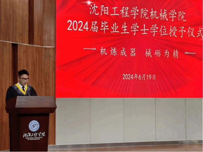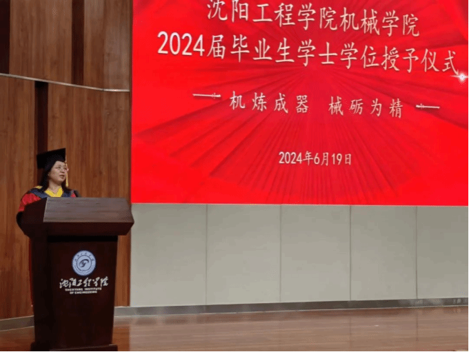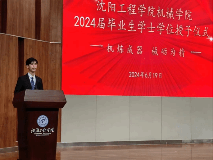 莘莘学子心,悠悠母校情。在校生代表陈佳伦给即将毕业的学长们送上了真挚的祝福,祝贺学长们圆满完成学业,感谢学长们一直以来对后辈们的关心、爱护、帮助和支持,在今后的学习生活中,将以优秀的学长们为榜样,学习他们拼搏的精神,努力沿着他们走过的路,继续创造机械学院的美好未来。