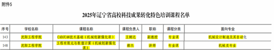 12月15日,我院在2025年辽宁省高校创新创业教育建设项目遴选中喜获多项认定,充分展现了学院在深化创新创业教育改革、推动产教融合方面取得的扎实成效。我院机械设计制造及其自动化专业获评“辽宁省高校创新创业教育特色专业”;《现代设计基础I》、《创新创业基础》入选创新创业特色课程;《CAD/CAM技术基础》、《工程有限元与数值计算》获评科技成果转化特色培训课程。