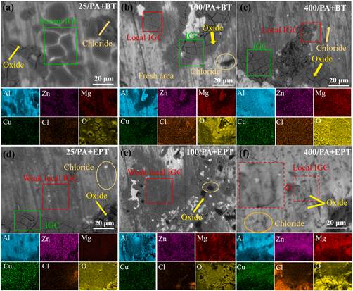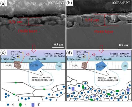 本研究采用100℃模具进行热压缩后,结合预时效与电脉冲处理(EPT),通过调控纳米颗粒结构实现了力学性能与耐腐蚀性能的协同提升。研究结果表明,EPT凭借其热效应与非热效应加速了沉淀析出过程。经EPT处理的试样表现出优异的耐腐蚀性,其厚氧化层、均匀分布的η′相以及高铜含量的大尺寸晶界沉淀相(GBP)有效抑制了阳极溶解,从而降低了腐蚀速率。与烘烤处理试样相比,腐蚀形貌由晶间腐蚀(IGC)/IGC+局部IGC转变为弱局部IGC。此外,提高模具温度与EPT的应用共同促进了应力腐蚀开裂(SCC)抗性的提升。EPT诱导形成的T相能够促使氢原子的重新分配,显著减少氢在其它有效陷阱的富集,从而增强SCC抗性。